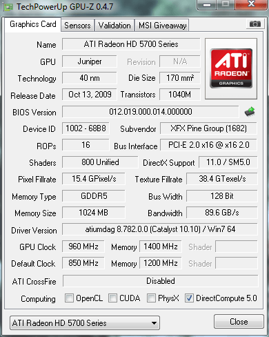GPU: XFX HD5770 1gig 850mhz Gpu Clock / 1200mhz Memory Clock