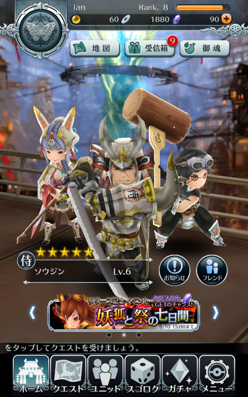 this is Samurai Rising, new mobile game from Square, you get a lot of chances first off you will get 8 draws to get a 5*, here I have two 5* the lady on the left, and this brute, who when you use his special it is a counter so if when you are hit after you use it standing still you literally kill everything around you...